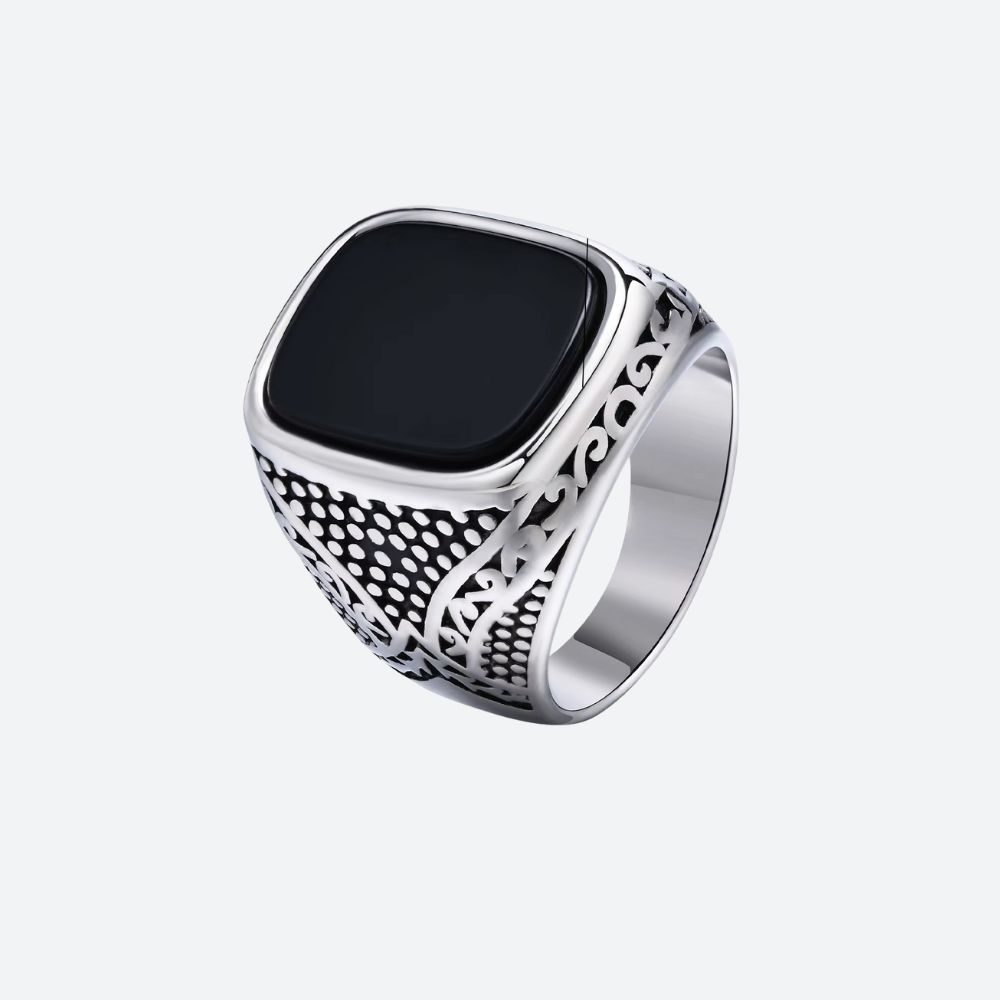 Symbole de force et d’assurance, cette chevalière en acier inoxydable affiche une pierre noire éclatante qui capte la lumière sans jamais la trahir. Un bijou au design fort et maîtrisé, conçu pour ceux qui aiment les détails distinctifs.