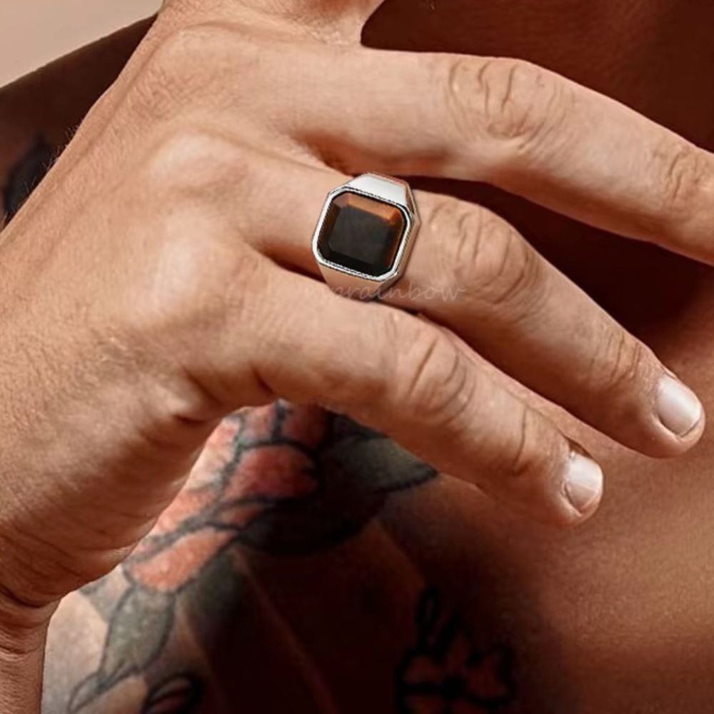 Avec ses lignes massives et son cabochon géométrique de 17 mm, cette bague s’impose comme un véritable statement visuel. Sa forme équilibrée souligne la main avec caractère, sans excès.