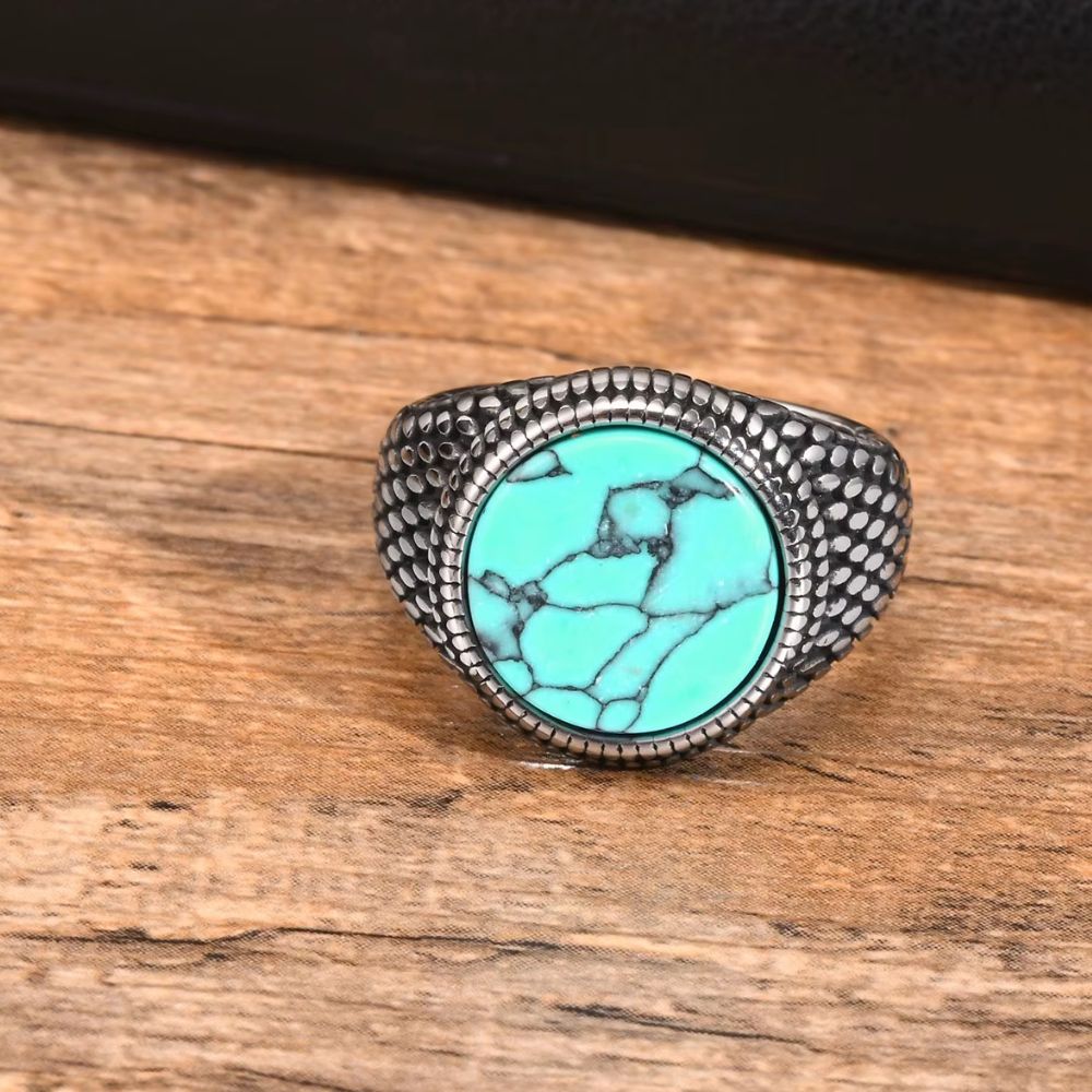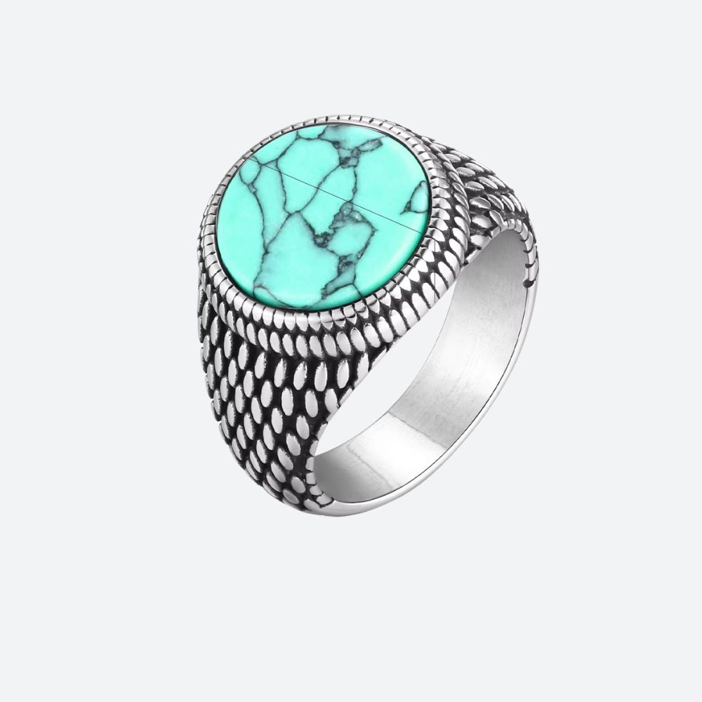 Conçue en acier inoxydable, cette bague associe durabilité et raffinement. Son anneau texturé, inspiré des motifs organiques, crée un contraste saisissant avec la douceur lumineuse de la turquoise.