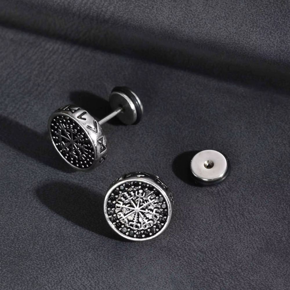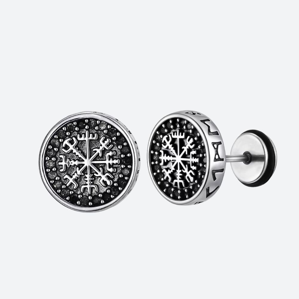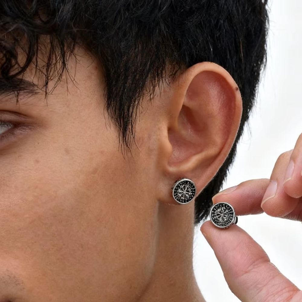 Les boucles d’oreilles homme original présentent le symbole du Vegvísir, ou boussole nordique, gravé au centre d’un cercle d’acier texturé. Ce motif ancien, censé guider son porteur à travers les épreuves, confère au bijou une dimension à la fois mystique et protectrice.