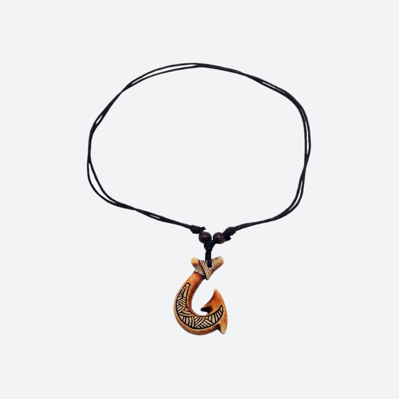 Collier homme au pendant hameçon, inspiré du motif maori. Il confère une prestance discrète et une signature personnelle. Portez-le pour affirmer une élégance sobre sans effort.