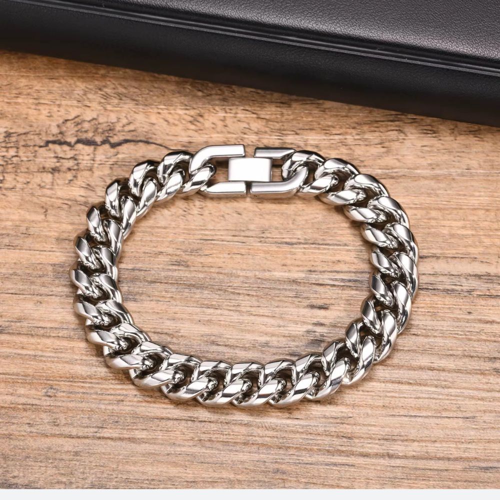Les maillons cubains de cette gourmette acier homme captent chaque reflet, évoquant force et assurance. Son poids équilibré et sa brillance soignée traduisent une maîtrise du détail qui attire le regard sans en faire trop.