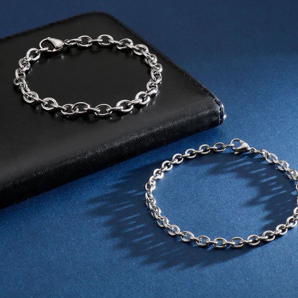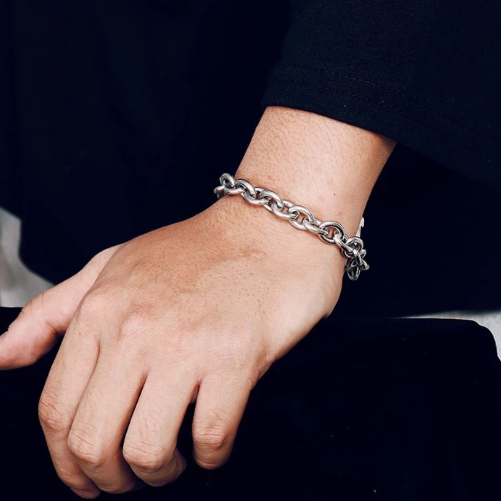 Chaque maillon, finement arrondi, crée un mouvement fluide et régulier autour du poignet. Sa finition miroir met en valeur la pureté de l’argent tout en soulignant la force tranquille de son design. Léger mais présent, il s’adapte à toutes vos tenues avec aisance.