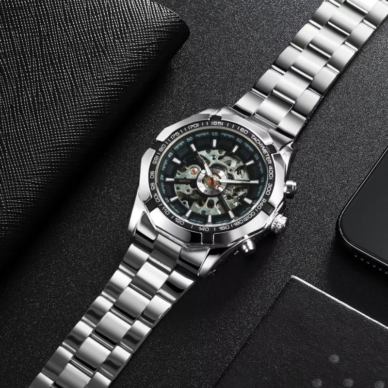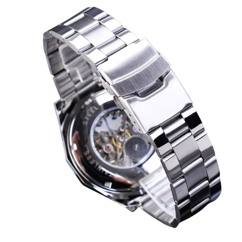 Le boîtier argent et le bracelet en acier poli créent un contraste subtil entre brillance et profondeur. Chaque reflet attire le regard, chaque angle révèle une facette différente de son allure futuriste.