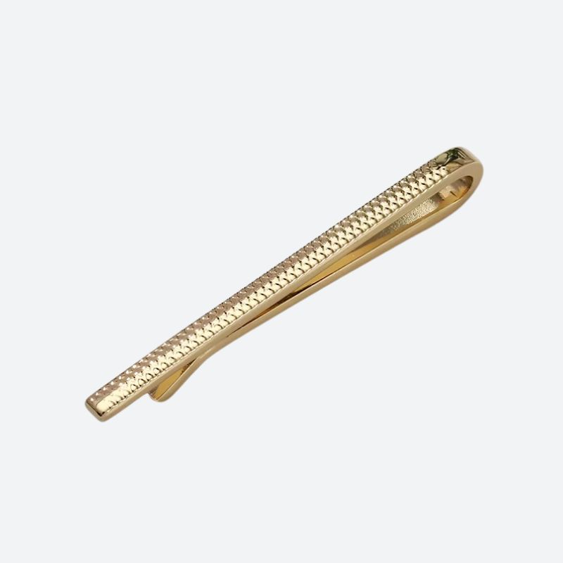 Cette pince à cravate dorée séduit par son éclat maîtrisé et sa texture délicate. Le relief ciselé capte la lumière, apportant une profondeur visuelle sans excès.