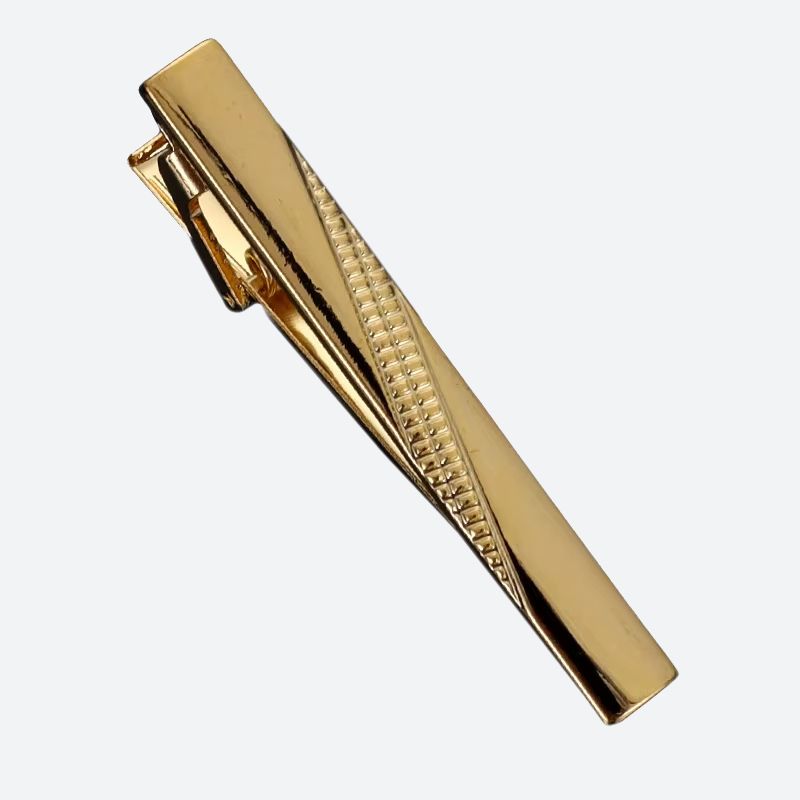 Cette pince à cravate dorée se distingue par sa surface brillante et sa texture subtilement gravée. Le contraste entre les zones polies et ciselées capte la lumière avec élégance, créant un effet visuel raffiné.