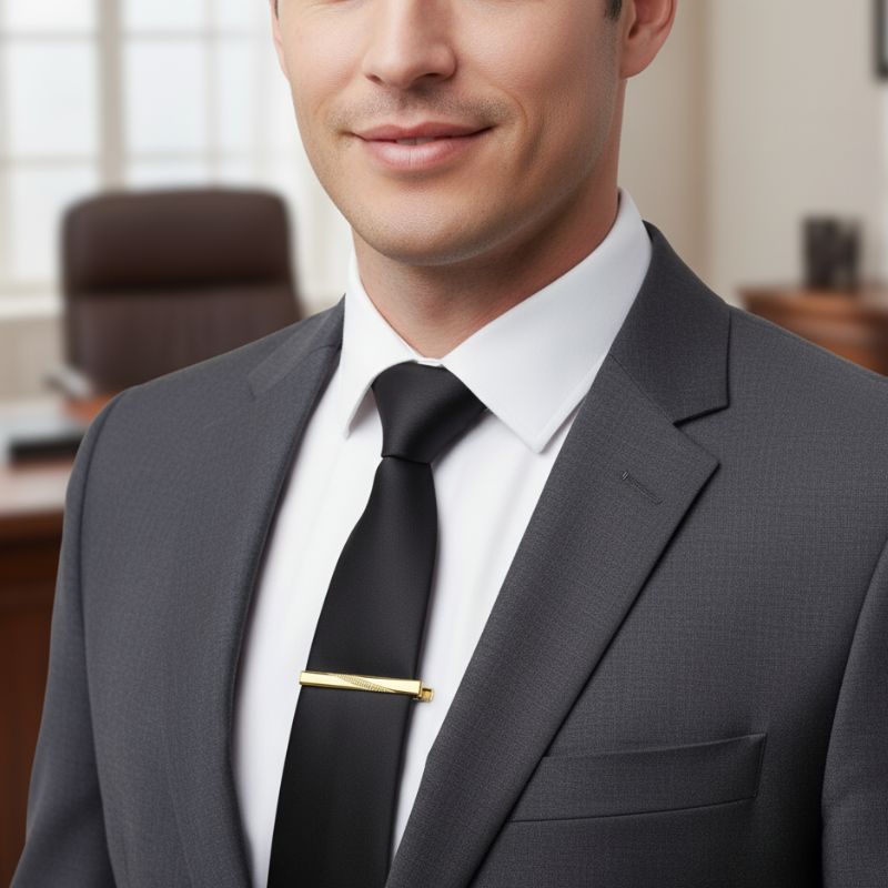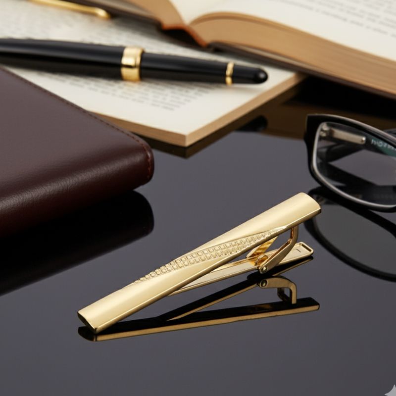 Portée avec sobriété, la pince à cravate dorée sublime votre apparence et souligne votre sens du raffinement.