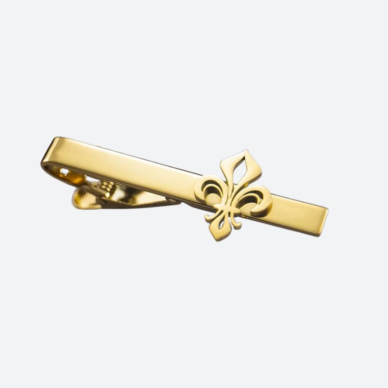 La pince à cravate fleur de lys séduit par son équilibre entre simplicité et raffinement. La surface dorée, lisse et brillante, souligne la finesse du motif central, véritable signature visuelle.